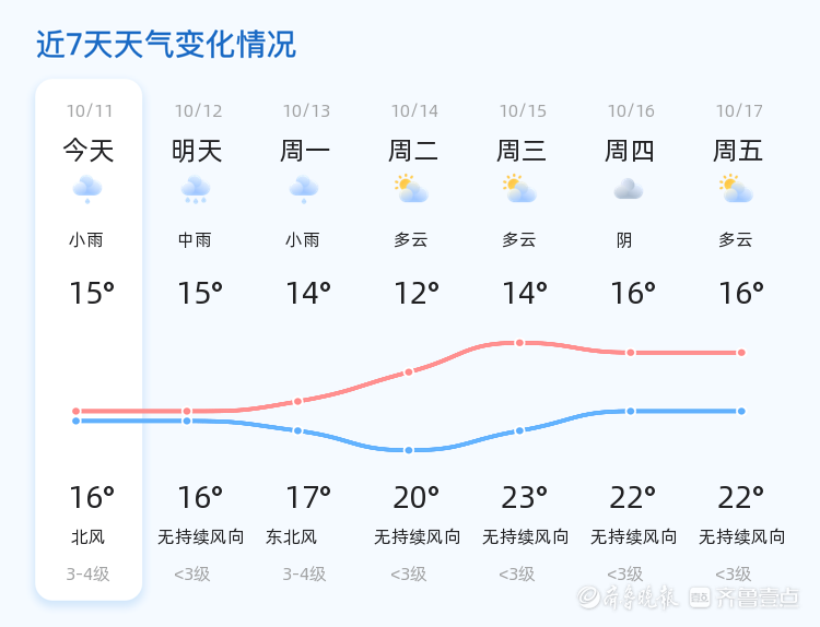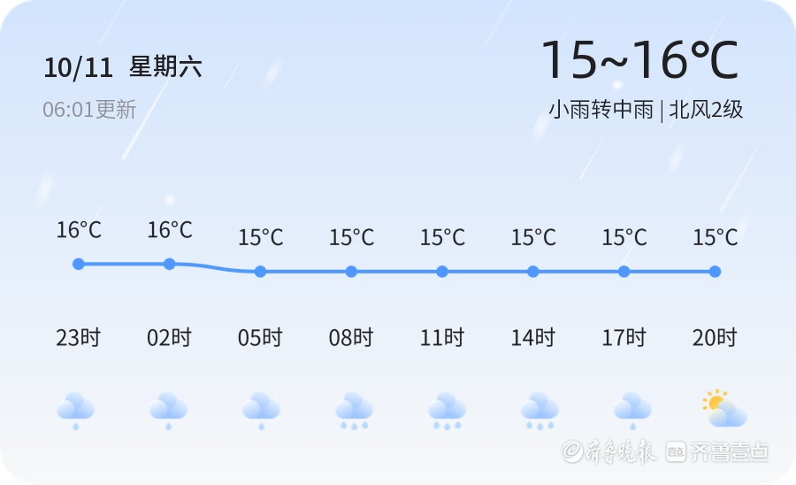 今天是10月11日,星期六,农历八月二十。东营市今日天气以小雨转中雨为主,气温在15℃到16℃之间,北风2级,空气湿度高达98%,PM2.5指数为20,空气质量良好。各区均迎来阴雨天气,市民出行需注意携带雨具,防范路面湿滑。
