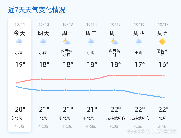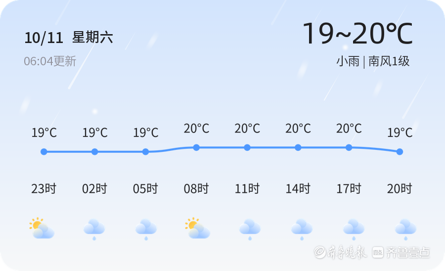 今天是10月11日,星期六,农历八月二十。威海市迎来小雨天气,气温在19至20摄氏度之间,湿度高达98%。各区均以小雨天气为主,南风1级,空气质量良好。市民出行需携带雨具,注意防雨防滑。