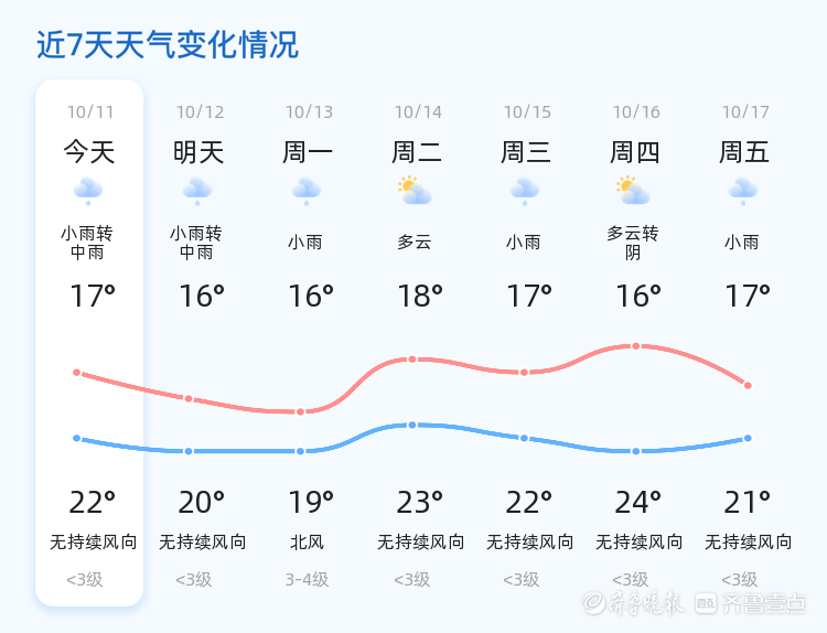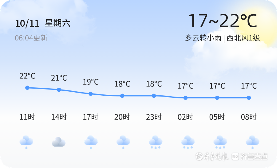 今日是10月11日,星期六,农历八月二十。日照市今日天气多云转小雨,气温在17℃至22℃之间,湿度较高,为92%,PM2.5指数为25。各区天气情况基本一致,均为多云转小雨,风力较小,以西北风1级为主,整体天气较为阴沉,局部可能出现短时小雨,市民出行需注意携带雨具。