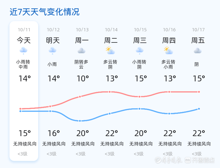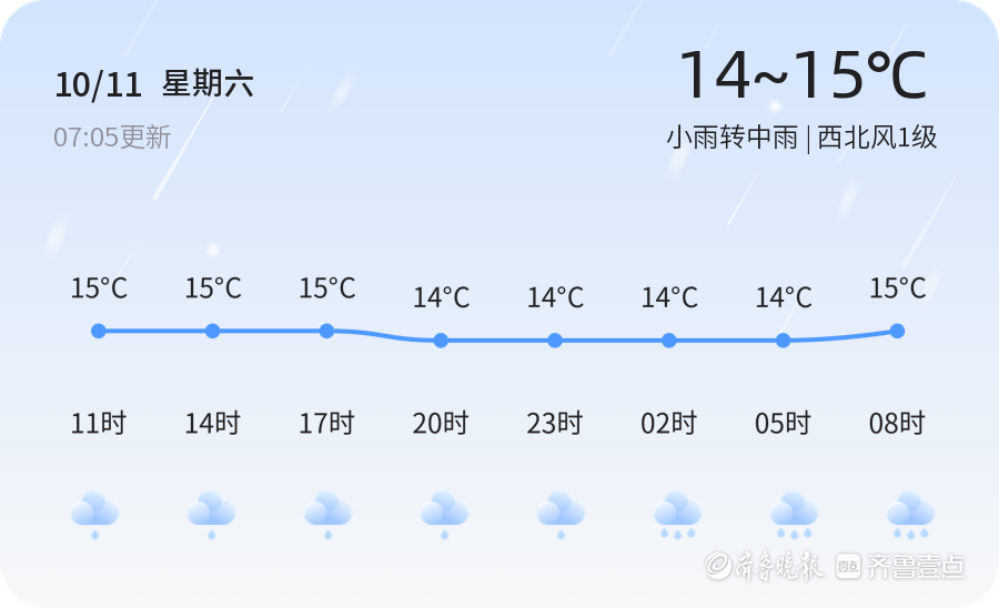 今天是10月11日,星期六,农历八月二十。淄博市迎来小雨转中雨天气,气温在14到15摄氏度之间,湿度达100%,空气质量良好(PM2.5指数14)。全市各区均出现降雨,风力较小,西北风1级,市民出行需携带雨具并注意防滑。