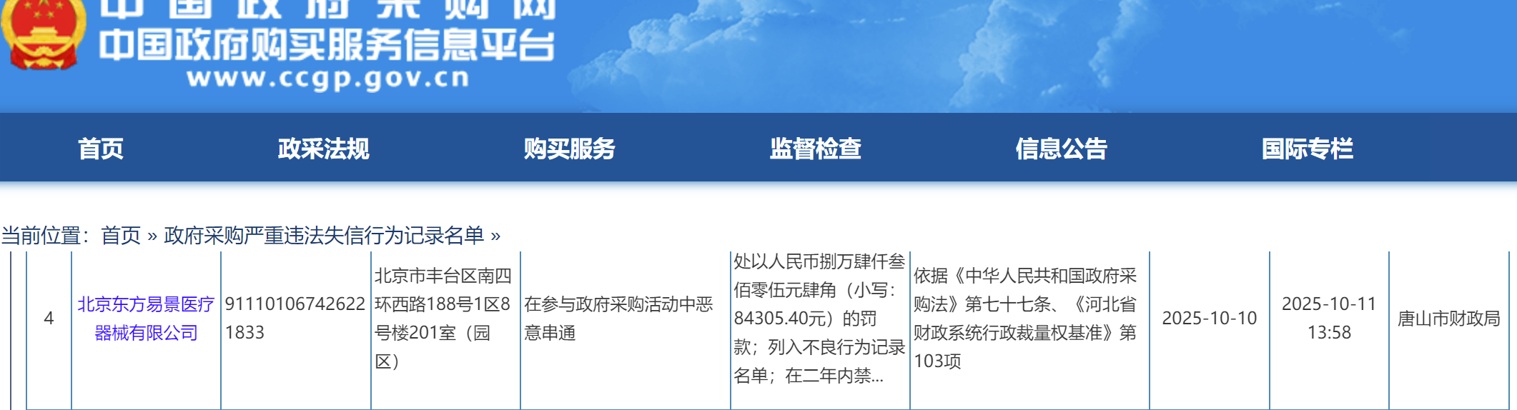 中国政府采购网近日发布的行政处罚信息显示,北京东方易景医疗器械有限公司(统一社会信用代码:911101067426221833)因在政府采购活动中存在恶意串通行为,被唐山市财政局依法处以罚款 8.43054 万元,并被列入不良行为记录名单,在两年内禁止参与政府采购活动。该处罚于 2025 年 10 月 10 日作出,10 月 11 日正式对外公布。