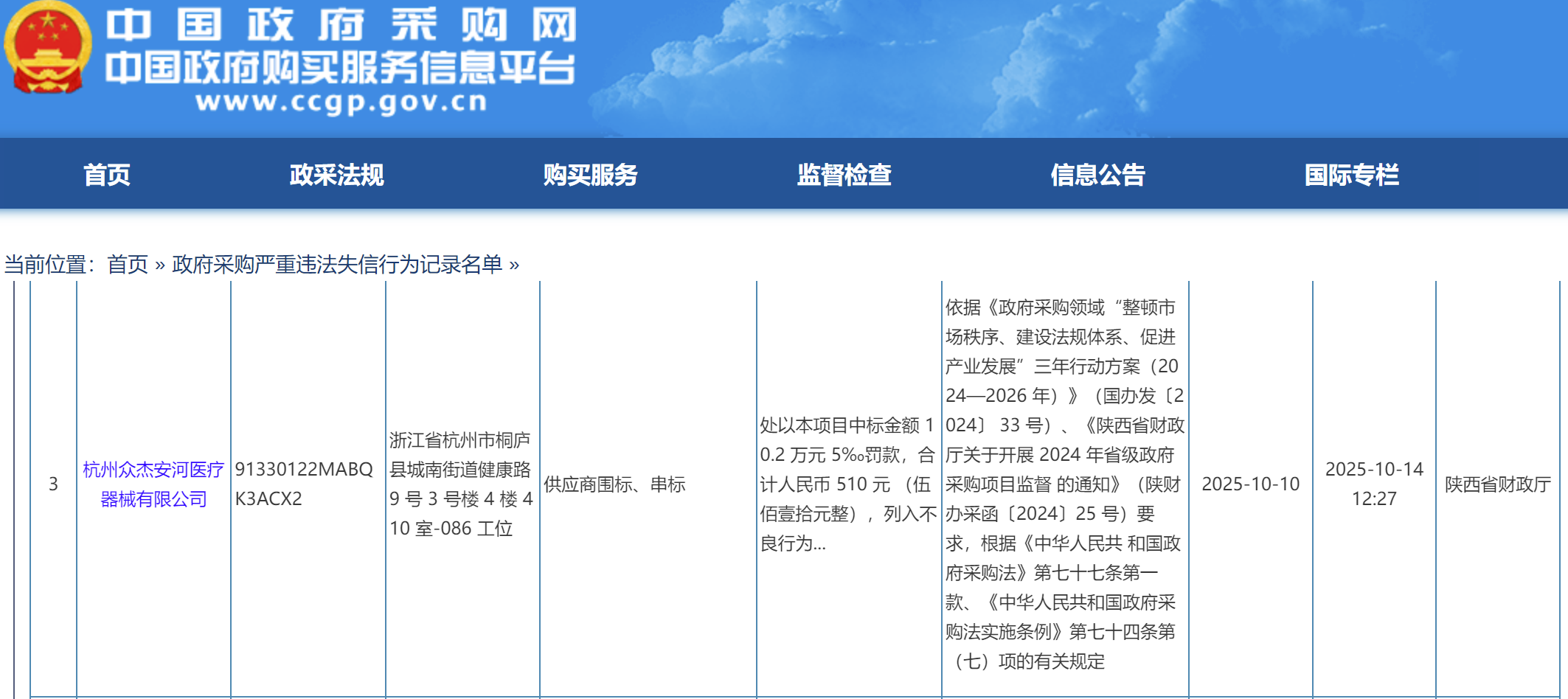 杭州众杰安河医疗器械有限公司注册地址位于浙江省杭州市桐庐县城南街道健康路 9 号 3 号楼 4 楼 410 室 - 086 工位。陕西省财政厅依据《政府采购领域 “整顿市场秩序、建设法规体系、促进产业发展” 三年行动方案(2024—2026 年)》(国办发〔2024〕33 号)、《陕西省财政厅关于开展 2024 年省级政府采购项目监督的通知》(陕财办采函〔2024〕25 号)要求,以及《中华人民共和国政府采购法》第七十七条第一款、《中华人民共和国政府采购法实施条例》第七十四条第(七)项的有关规定,对该公司作出处罚。