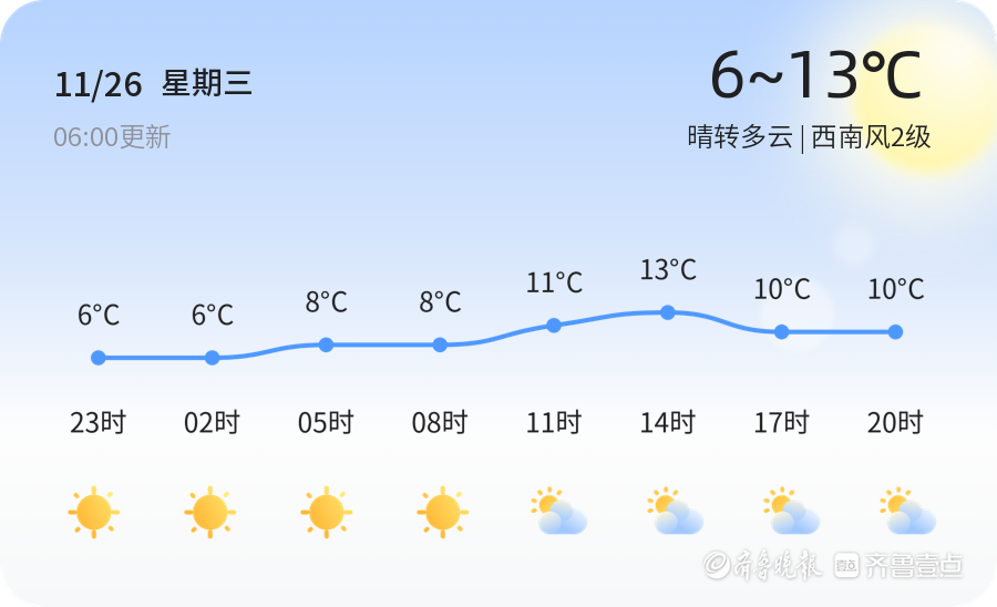 今天是2025年11月26日,星期三,农历十月初七。济南今日天气晴转多云,气温介于6℃至13℃之间,西南风2级,空气湿度29%,PM2.5指数为77,空气质量等级为良。市民外出时请注意保暖,适时添衣,同时由于天气晴朗,阳光较强,建议做好防晒措施。此外,今日风力较小,适合户外活动。