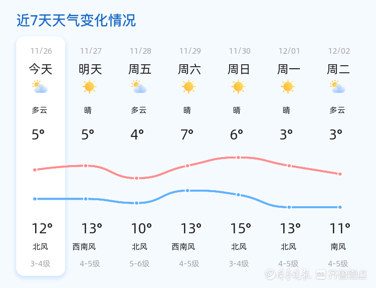 今天是11月26日,星期三,农历十月初七。青岛市迎来多云转晴的好天气,气温在5℃到12℃之间,南风2级,空气湿度为42%,PM2.5指数为54,空气质量良好。各区天气情况基本一致,市民可以享受较为舒适的户外活动。