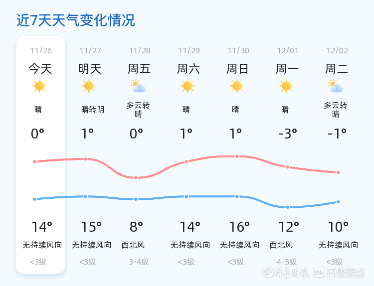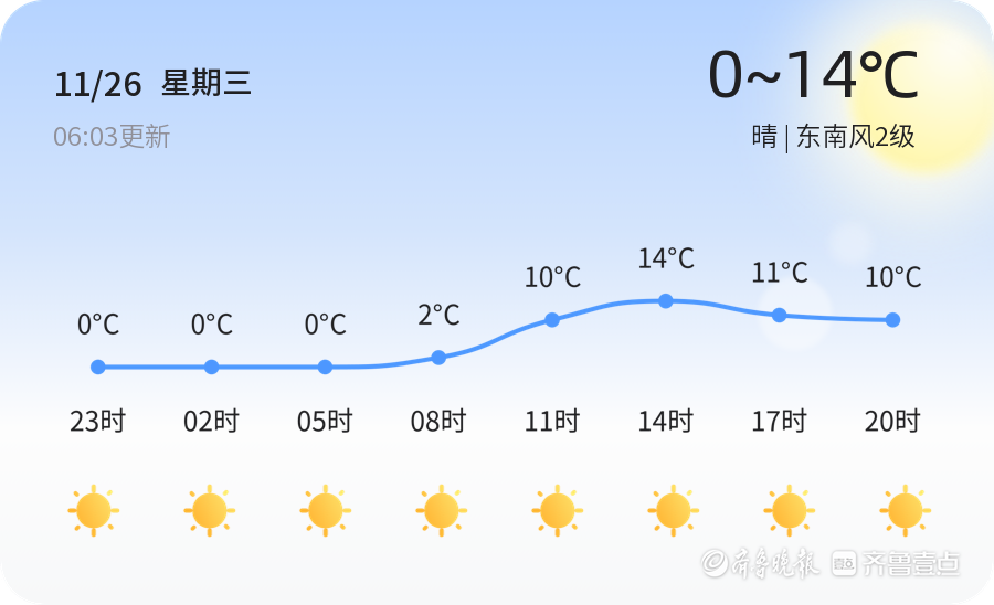 今天是11月26日,星期三,农历十月初七。潍坊市今日天气晴朗,气温在0℃到14℃之间,东南风2级,空气湿度为42%,PM2.5指数为65。各区天气情况基本一致,均为晴朗天气,温差不大,风力较弱,整体天气平稳。