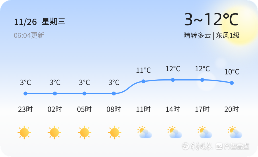 今天是11月26日,星期三,农历十月初七。济宁市今日天气晴转多云,气温在3℃到12℃之间,东风1级,空气湿度55%,空气质量状况为良(PM2.5值为80)。今天的天气适宜出行,但早晚温差较大,市民应注意保暖,适时增添衣物。建议市民在外出时佩戴口罩,做好防护措施。