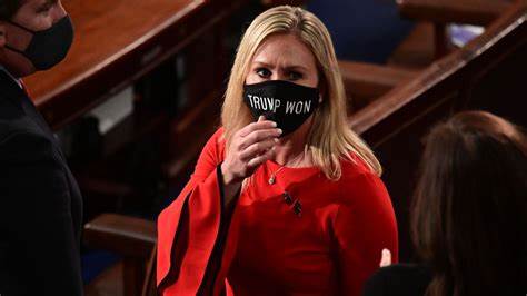 特朗普在2020年总统选举中败北,陷入多起官司后,格林对他的支持丝毫不减。2021年1月,刚以政治新人身份当选众议员的格林,上任第一天就戴着印有“特朗普赢了”字样的口罩出现在国会大厦。格林积极响应特朗普宣称的有关“大选结果作弊”言论,拜登就任总统第二天,她就提交了一份弹劾拜登的文件,指控其“滥用职权”。