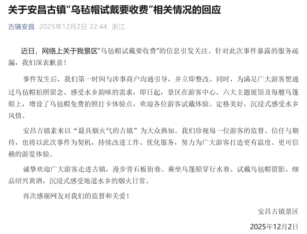 事件发生后,我们第一时间与涉事商户沟通引导,并立即整改。同时,为满足广大游客想通过乌毡帽拍照留念、感受水乡韵味的需求,即日起,景区在游客中心、六大主题展馆及每艘乌篷船上,增设了乌毡帽免费拍照打卡体验点,欢迎各位游客试戴体验、定格美好,沉浸式感受水乡风情。
