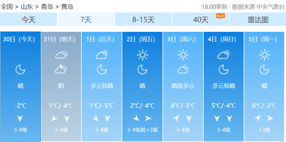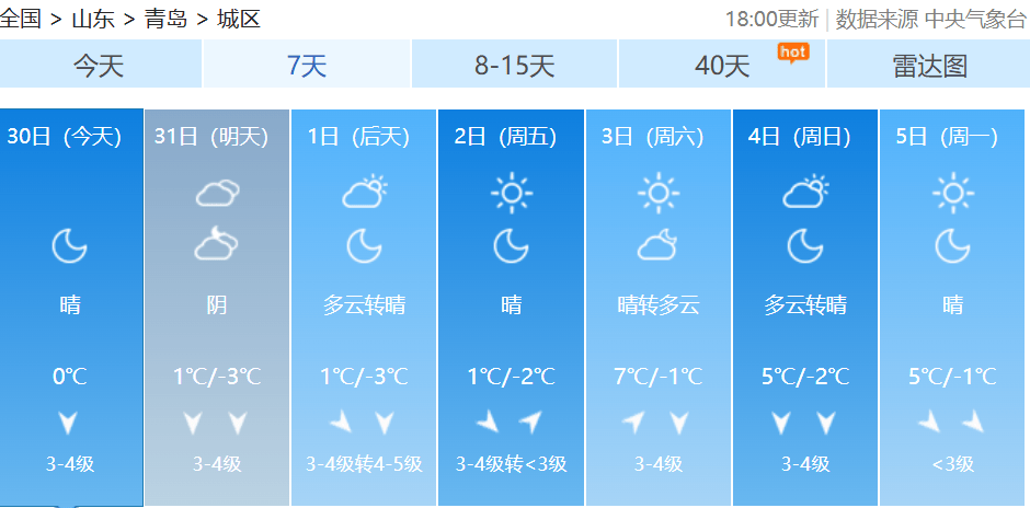 【青岛市区】12月31日白天,晴转多云,北风3到4级阵风6级,相对湿度30%~80%,31日最低气温-1℃,最高气温2℃。