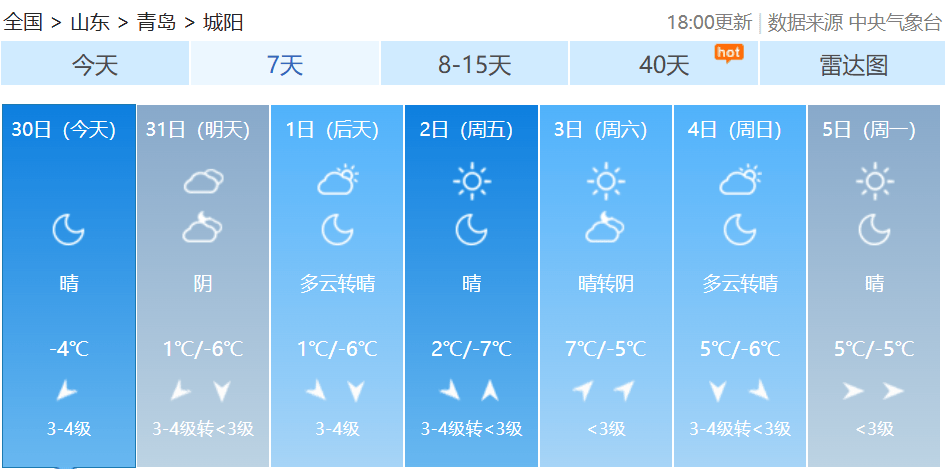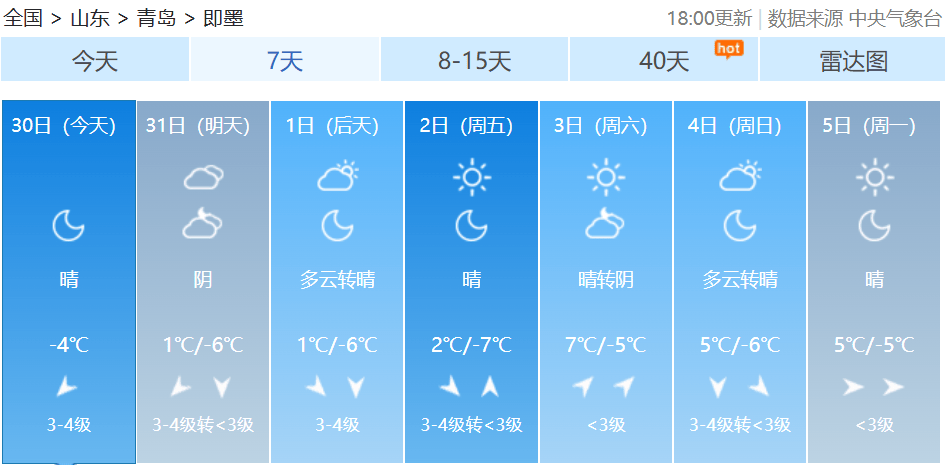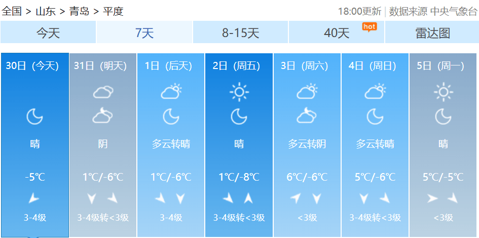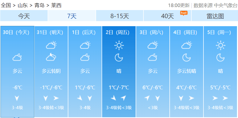 1月1日:多云间晴,傍晚到夜间平度、莱西及即墨北部地区有分散性小阵雪,北风3~4级转4~5级阵风6级,最低气温全市-7~-3℃,最高气温全市1℃。
