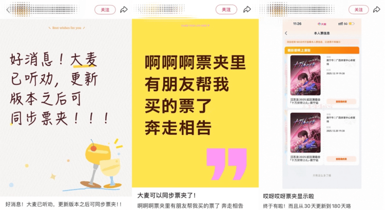 测试期间,不少用户在社交媒体分享使用体验,频频称赞“大麦真的听劝!”“朋友抢的票自己也能看到了,终于不用再要截图了,安全感拉满!”。用户普遍认为,该功能让线下演出观演体验更便捷、更安心。