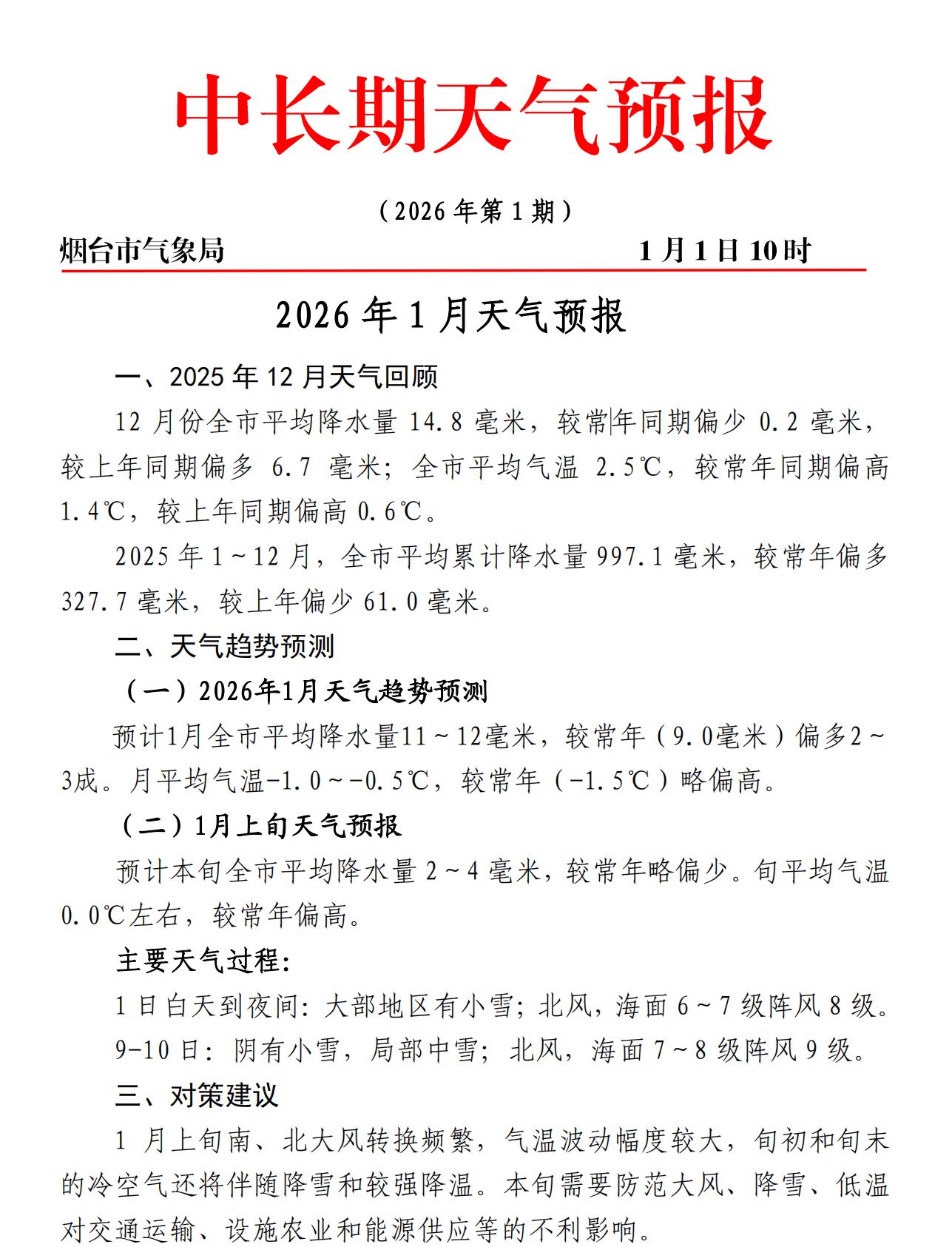 1月1日10时,烟台市气象局回顾2025年12月天气情况,并发布2026年1月天气预报。1月上旬,南、北大风转换频繁,气温波动幅度较大。9日至10日,局部或迎中雪。