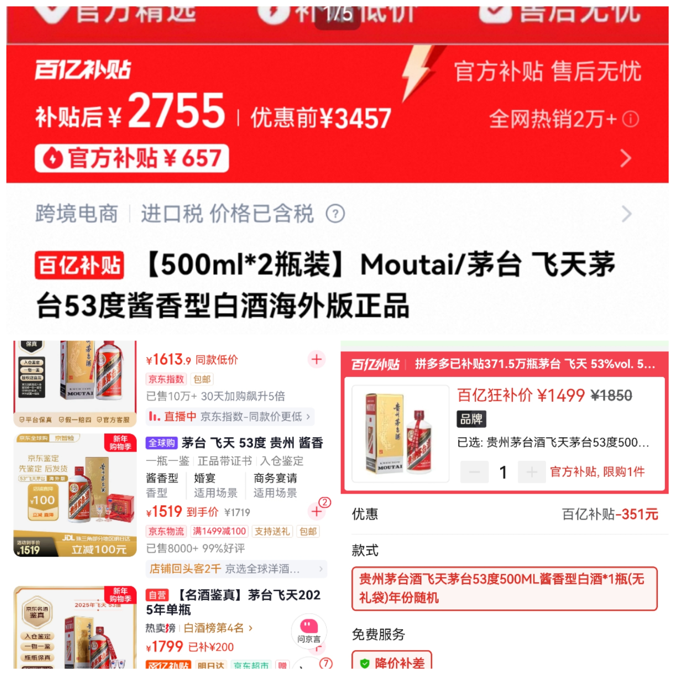 横向对比各电商平台可见,1499元的官方指导价形成明显价格锚点。拼多多同步给出1499元/瓶的平价,与官方平台持平;京东售价普遍超过1500元,两瓶组合装定价3030元,折合单瓶1515元;淘宝官方正品单瓶价约1650元,一家参与百亿补贴的海外版双瓶装2755元。而在此前,该款飞天茅台终端零售价一度高达2700元—3000元,与官方直销价存在显著价差。