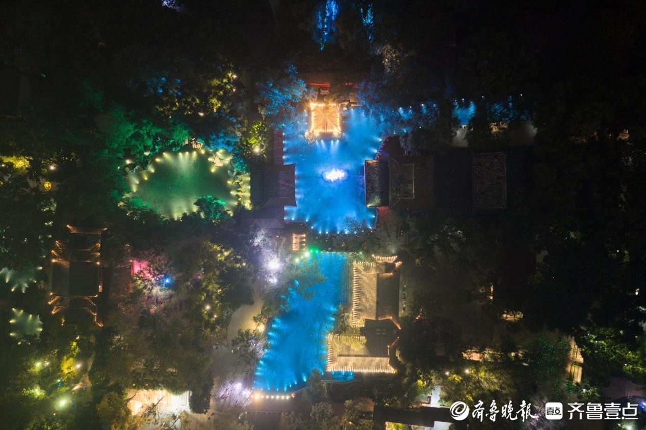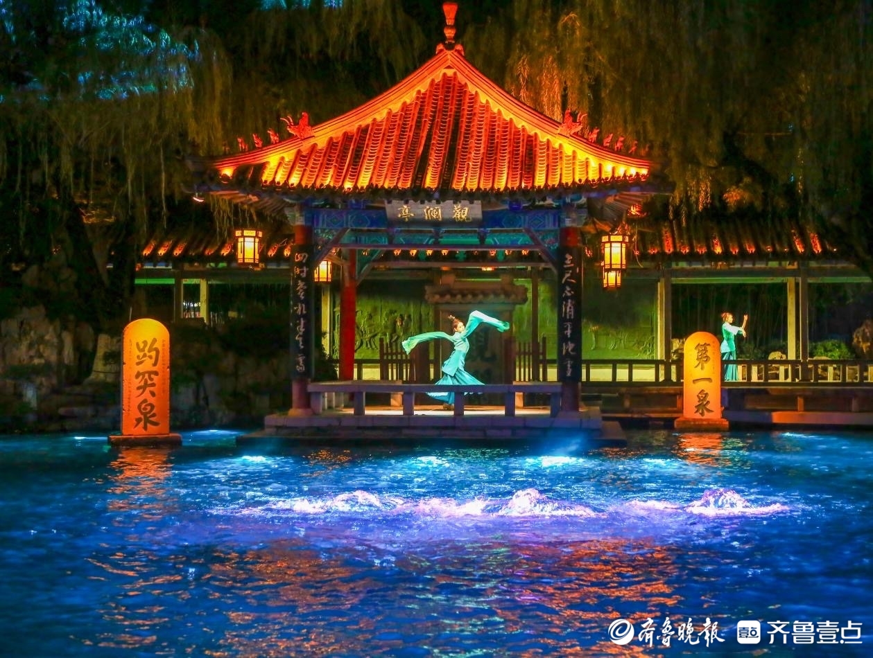 白日赏泉观戏,夜晚则赴一场梦幻夜游之约。《趵突夜画》深度挖掘泉水文化与李清照、辛弃疾等名士文化内涵,依托园林实景搭建演出场景,巧妙融合舞蹈、民乐、光影秀、诗词吟诵、NPC互动等多元演艺手法,借助前沿光影科技,将千年泉水化作流动的光影诗篇,打造出一个“可赏、可游、可听、可感”的立体文化体验空间,每晚八点准时守候,带您沉浸式感受泉城华彩夜梦。