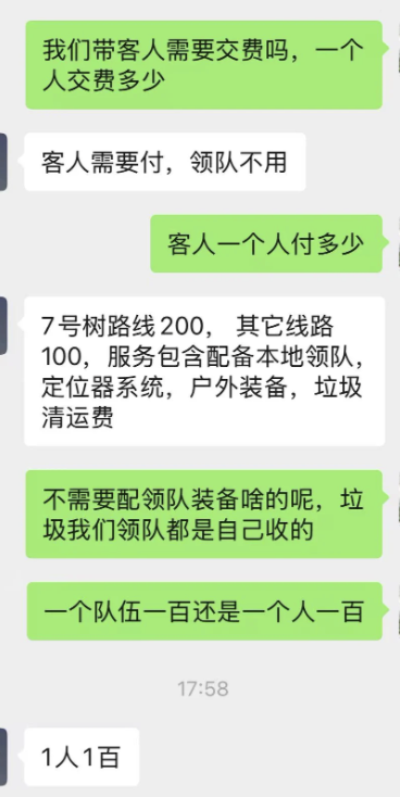 社交聊天截图显示,有户外徒步组队信息标注“队员100元/人”。网络截图