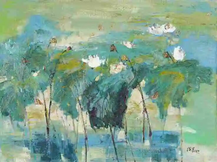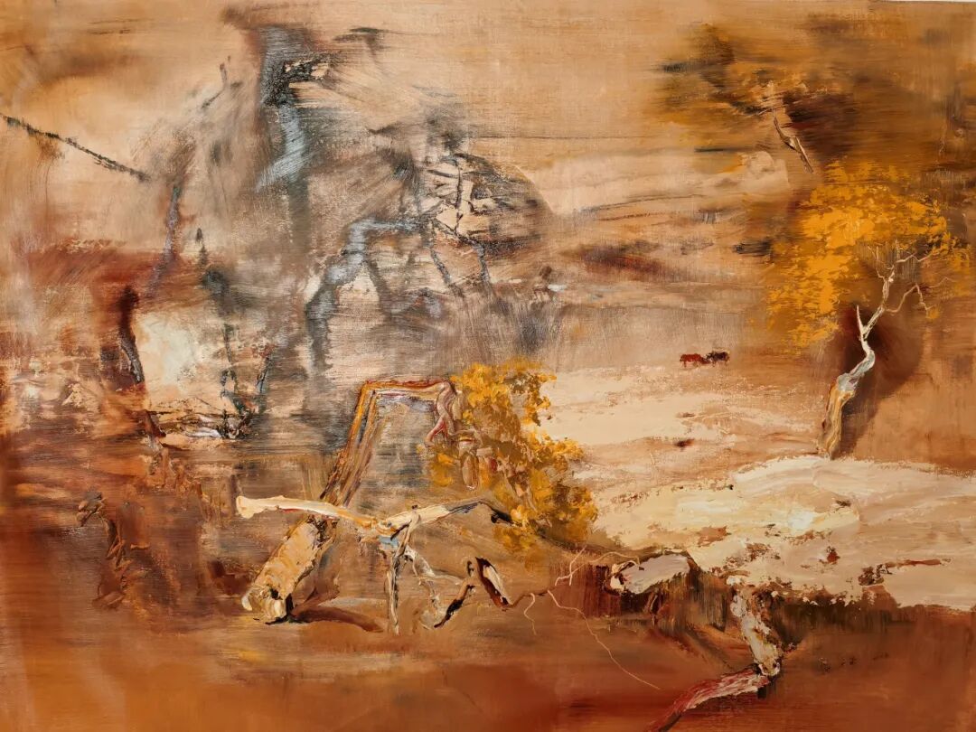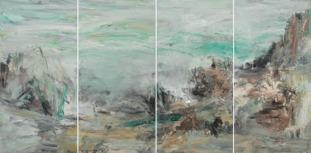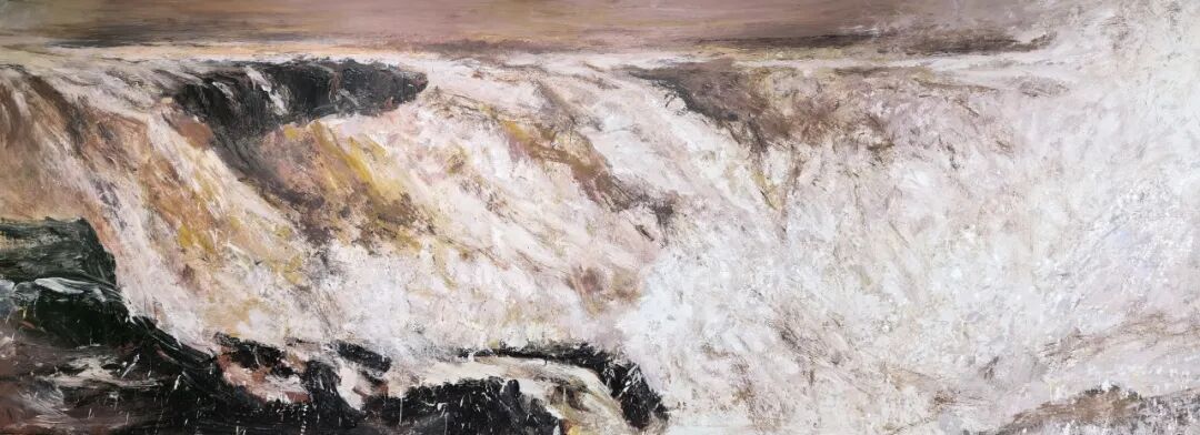 在山水主题的油画创作中,他并未拘泥于再现自然的表象,而是以中国山水画“可行、可望、可游、可居”的观照方式,构建流动而开放的视觉结构。画面中,色彩的铺陈与光影的层叠并非单纯的形式实验,而是服务于整体气韵的生成,使油画这一西方媒介焕发出内敛、含蓄而悠远的东方审美意境。正是在这种“以中驭西”的探索中,他不断拓展着油画民族化的表达边界。