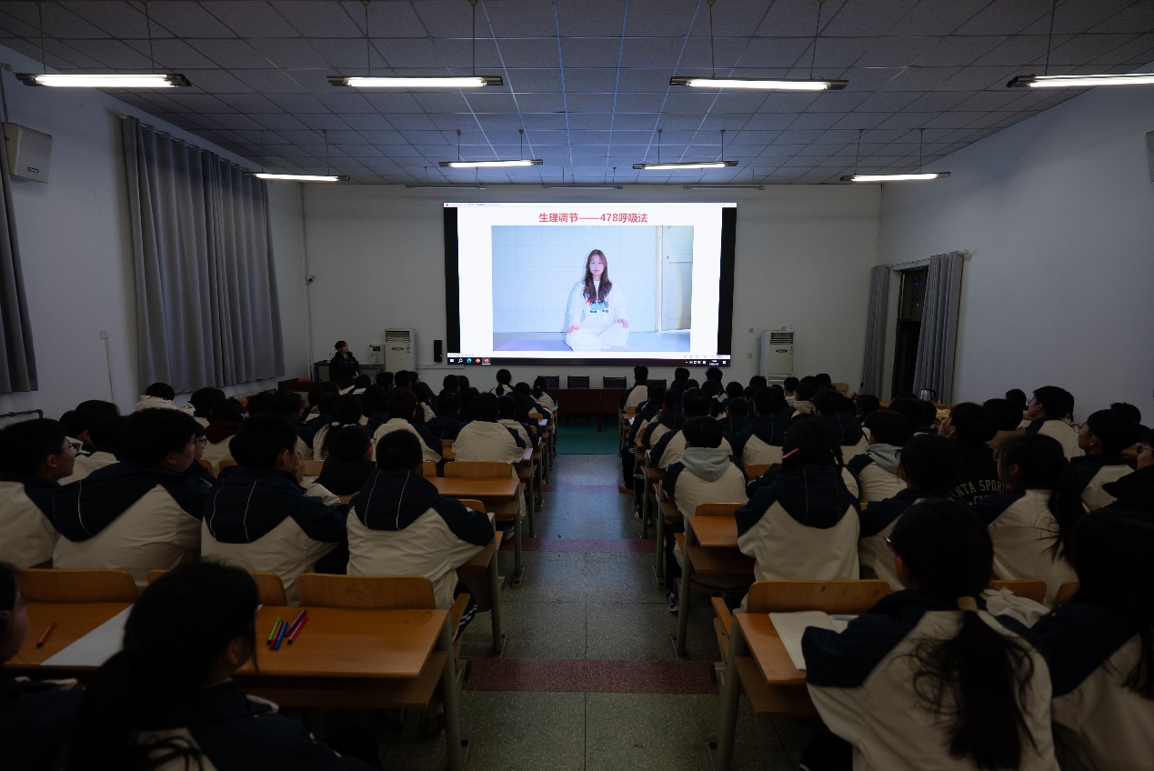 在“做情绪的主人”情绪调节体验环节,实践队员王丹、邱娅以互动游戏引入情绪主题,通过案例解析情绪功能,引导学生形成对情绪的正确认知;现场指导学生掌握“478呼吸法”等可操作、可迁移的自我调节工具,并结合学业压力、人际困扰等情境讲解“认知调节法”,帮助学生提升自我觉察与自我支持能力,把“会学习”与“会调适”同步纳入成长能力结构。