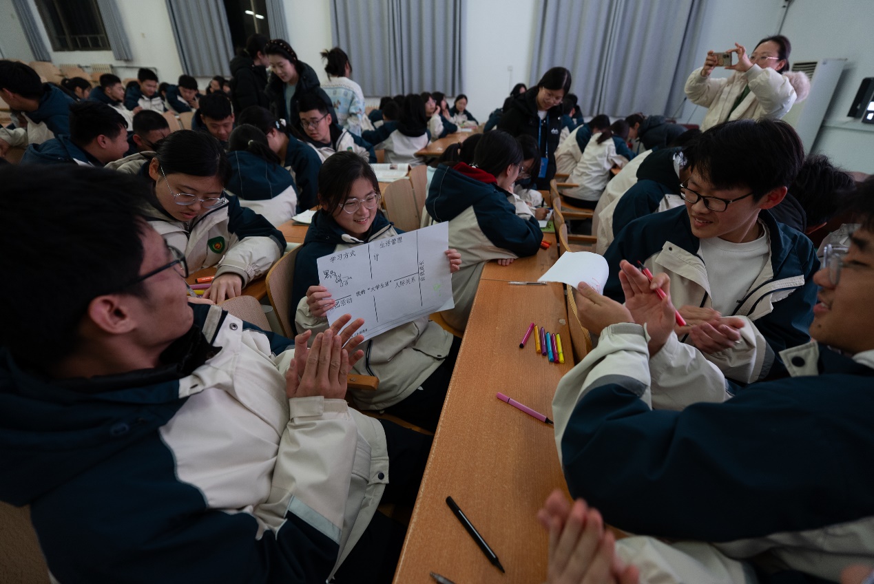 在“与大学面对面”环节,志愿者组织学生开展“海报共创”,围绕学习方式、生活管理、自我成长等模块描绘大学生活图景,集中回应“大学选课”“社团发展”“专业学习”等关切问题,并进一步引导学生思考高中阶段的能力储备与目标管理,推动生涯教育从“被动接受”走向“主动规划”。