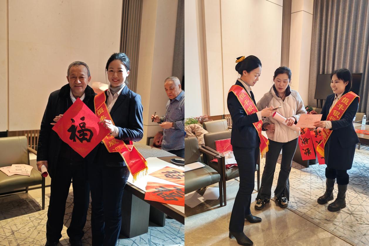 活动现场墨香四溢,志愿者与书法爱好者挥毫泼墨。恒丰银行工作人员与居民亲切交流,将满载祝福的春联送到居民手中,传递节日温暖。