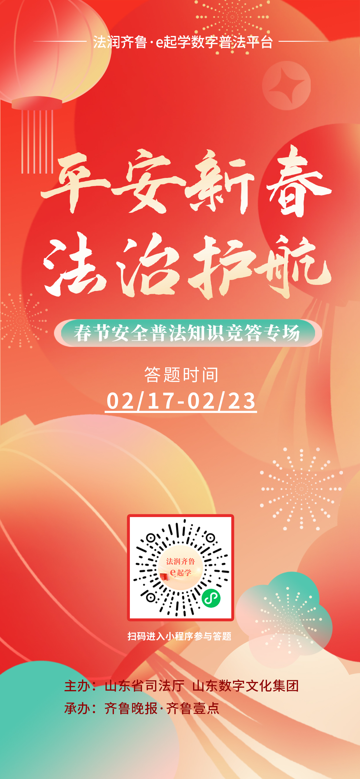 新春将至,平安相伴!2月中旬春节假期、春运高峰与元宵节接踵而至,人流车流密集,电信诈骗、烟花爆竹燃放、交通出行等各类安全风险叠加,家庭团圆与节日祥和亟待法治守护。由山东省司法厅、山东数字文化集团主办,齐鲁晚报・齐鲁壹点承办的“法润齐鲁・e起学”春节安全知识竞答专场正式开启。本次活动以“平安新春 法治护航”为核心主题,聚焦春节期间民生安全关键法律要点,邀您在答题互动中筑牢法治认知,为新春佳节撑起安全防护伞,答题全对更可抽取现金红包与普法好礼,让法治阳光守护每个家庭的团圆时刻。