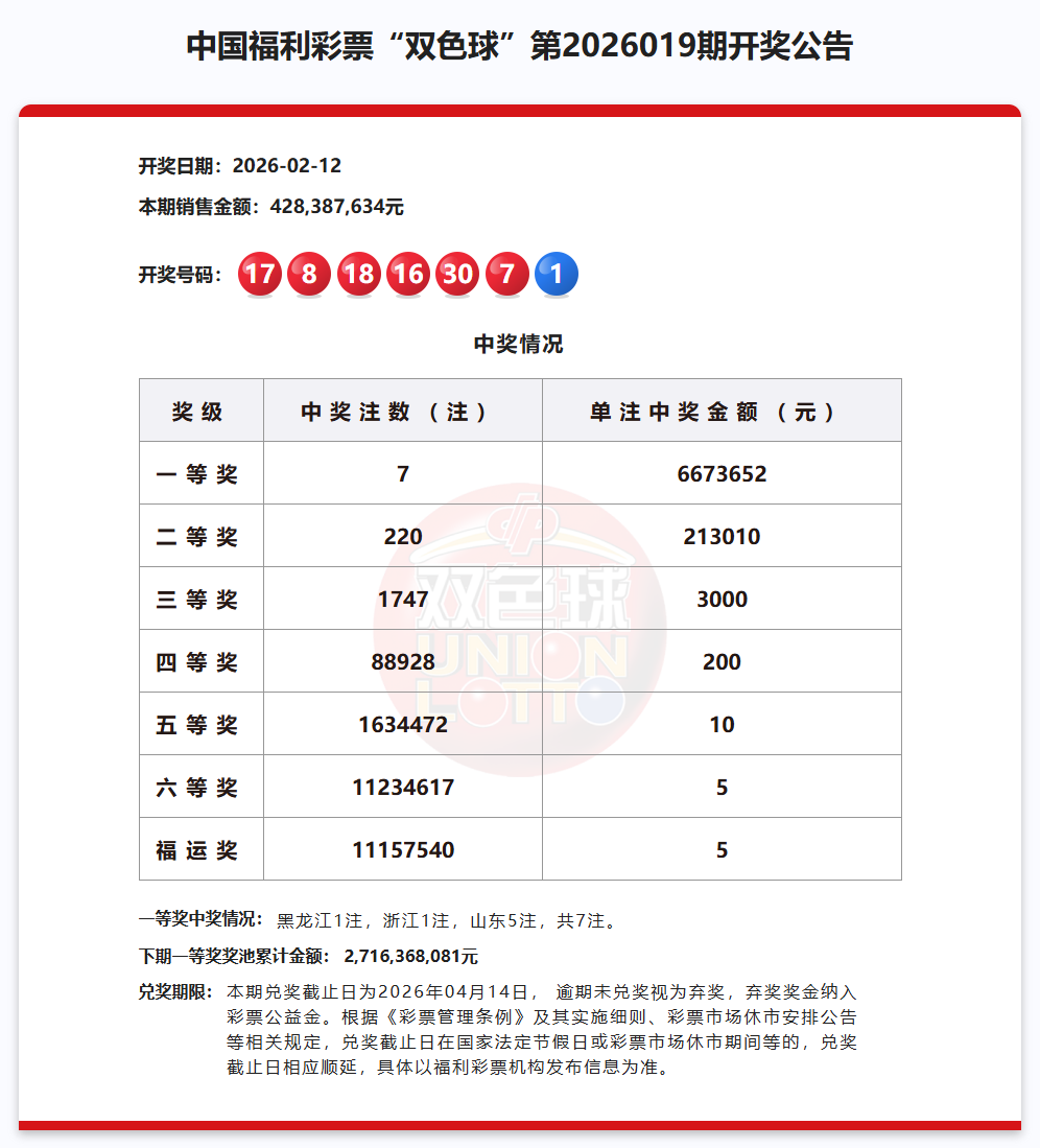 双色球开奖 第2026019期 2月12日 开奖号码 一等奖 黑龙江(1注)浙江(1注) 山东(5注) 奖池金额27.16亿元 本期销量 4.28亿元 筹集公益金 1.54亿元 量力而行 理性购彩 (来源:“中国福彩”微信公众号)