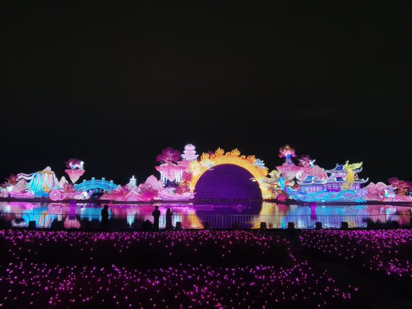 现代技术,让传统‘活’起来。不同于传统静态灯彩,本届灯会在保留手工工艺核心的同时,系统引入智能控制、动态灯效与声光联动技术。以超220米水上灯组“桃海仙踪”为例,其整体结构仍以传统灯彩骨架为基础,但在水面环境、风力变化与夜间反射条件下,对防水材料、电路分区与亮度层级提出了极高要求。制作团队需在施工现场反复测试,确保灯组在大尺度展示中既安全稳定,又保有细腻层次。