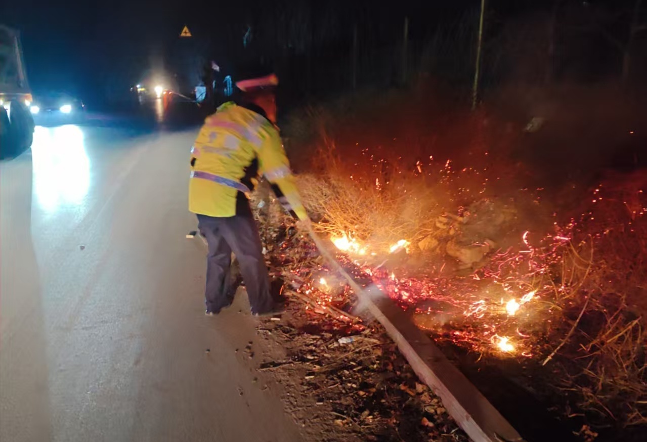 22时20分许,观城中队执勤民警巡逻至古樱路某段时,突然发现路边一堆树枝燃起熊熊大火,火苗在夜风中乱窜,周围枯草丛生,情况十分危急。