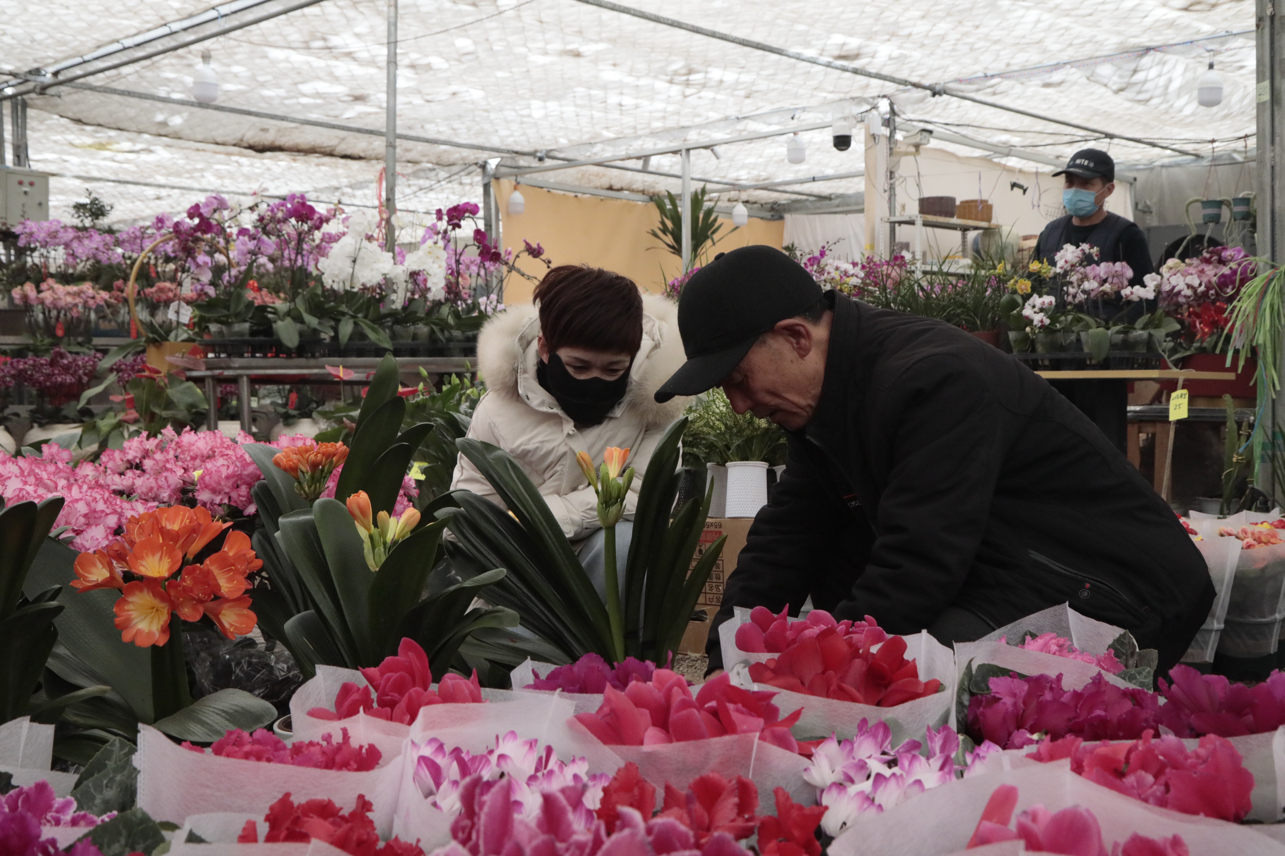 “我们这里有蝴蝶兰、大花蕙兰、杜鹃、仙客来、丽格海棠,以及各种小盆栽、绿植等各式年宵花300多种,种类十分丰富。”新甫街道后上庄村花卉苗圃负责人任玉鑫介绍说:“随着年关临近,客流量持续增长,日均成交量达五六百单,销售额较平日也大幅上涨。”
