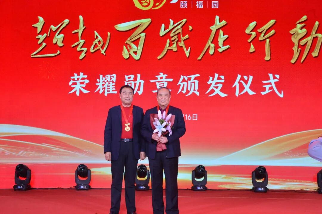 在热烈的掌声中,刘曰兴与12位业主代表共同启动“超越百岁在行动”计划。并为年长业主代表颁发纪念勋章;业主代表也为刘曰兴授予勋章,寓意领航者与家人们同心同行。