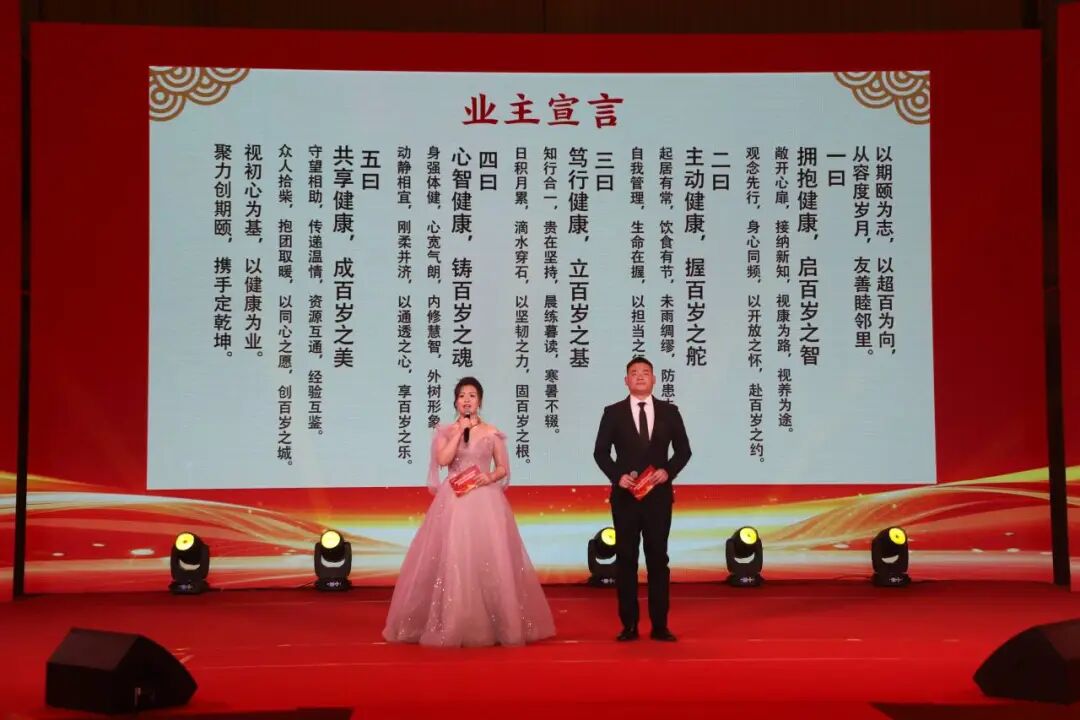 启动仪式后,主持人诵读了《万物生业主宣言》。宣言以“以和为贵、三生共赢”为核心,融合传统哲学智慧与现代康养理念,传递出业主们共建美好家园的共同心声。远在海外的业主家人也通过视频送来新春祝福,跨越山海的情谊让现场暖意融融。