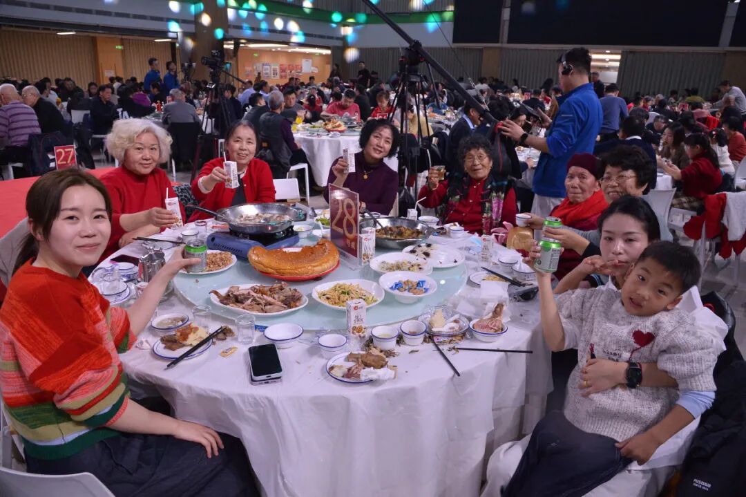 晚宴环节,物业团队精心准备的饺子、菜肴陆续上桌。包饺子时录制的视频在大屏播放,主持人实时解读“口福金圆”活动,大家边吃边聊,其乐融融。晚20时,现场转播央视春晚,家人们继续围坐守岁,共度良宵。