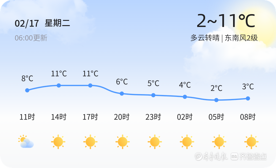 今天是2月17日,星期二,农历正月初一。济南市今日天气多云转晴,气温介于-1.6℃至11℃之间,东南风2级,空气湿度35%,PM2.5指数为134。全市各区天气情况基本一致,整体以多云为主,部分地区有晴朗天气出现,气温较为平稳。市民朋友们在享受冬日阳光的同时,也需注意保暖,防范寒冷天气带来的不适。