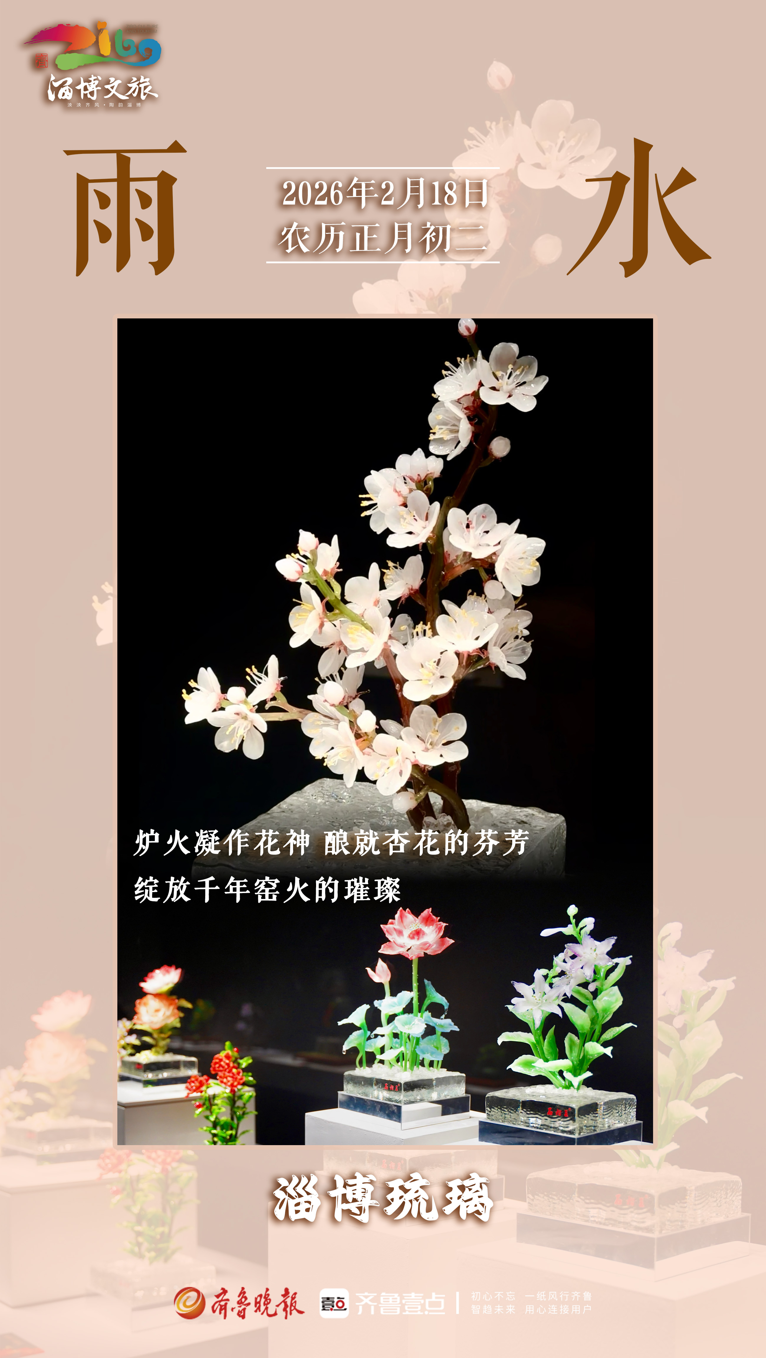 匠心给予琉璃形魄,雨水赋予万物生机,以二月杏花为信使,唤醒沉睡的泥土,带来天地初润的讯息。这讯息,是淄博琉璃里流转的春色,是花瓣间凝固的时光,更是匠人与二十四节气对话的匠心独运。