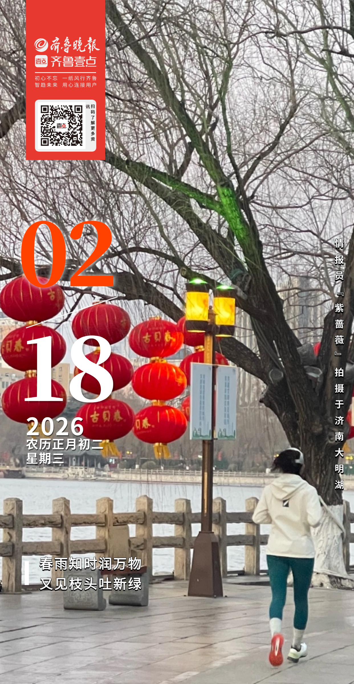 新春至,济南大明湖畔一片喜庆祥和!一串串红彤彤的灯笼高高挂起,似燃烧的火焰点亮湖岸。浓郁年味扑面而来,市民们携亲伴友走进公园,沉浸在这热闹的过年氛围中。