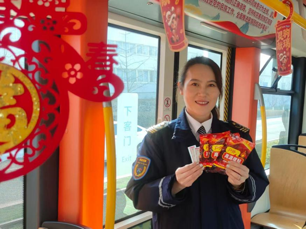 “新年快乐,欢迎乘坐青岛有轨电车。”轨道巴士乘务员泮茜茜已是第五个春节坚守在岗位上。今年,细心的她提前用中国结、窗花装饰车厢,让乘客一上车就感受到浓浓年味。