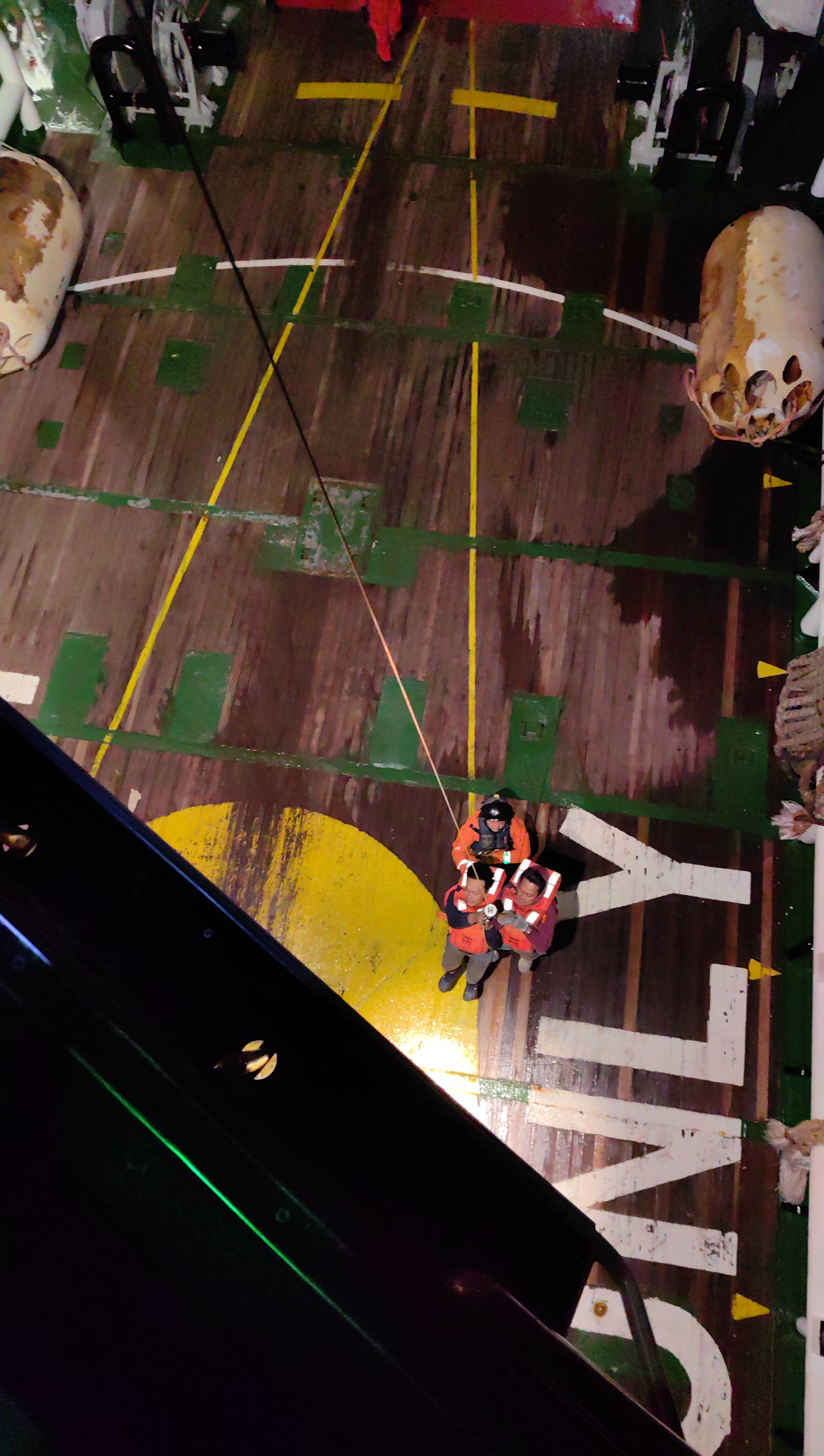 22时许,救助直升机、救助船舶先后抵达事发海域。现场西南风5级,浪高2米,夜间能见度低下。救助人员凭借精湛的海上搜救技术和经验,高效锁定目标船只,并根据现场状况,科学评估,确定了船机联动救助方案,快速展开救援行动。救助直升机“B-7125”迅速降落至遇险船甲板实施救援,“B-7312”实时监控救助行动和船舶动态,随时准备应对突发状况接替作业。因遇险船停机坪承载力仅有4吨,低于直升机11吨的满载重量,机长凭借高超的驾驶技术,采取“轻着陆”方式,最大限度降低对甲板的压力,救生员克服语言沟通障碍,引导16名船员依次快速进入机舱,其余船员坚持留守“曼迪”轮。