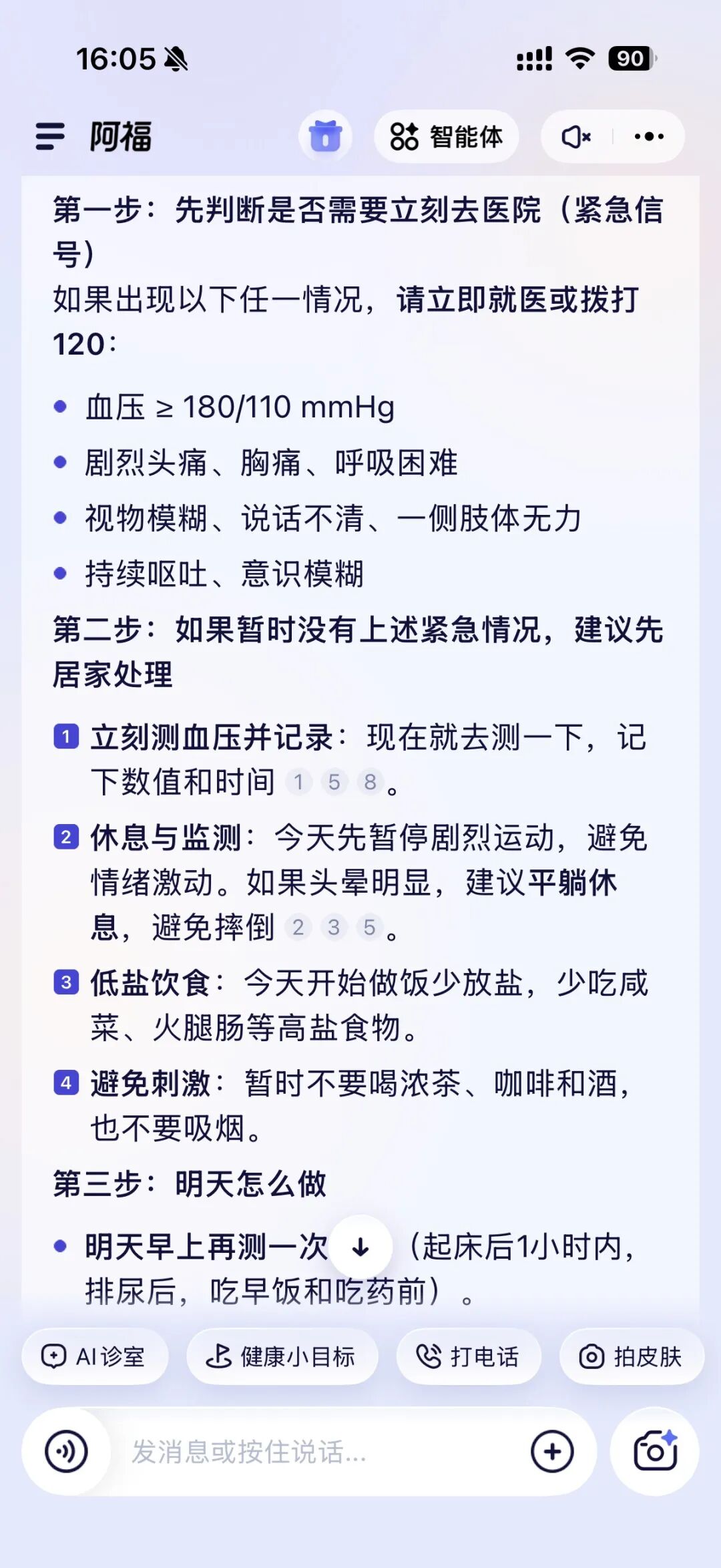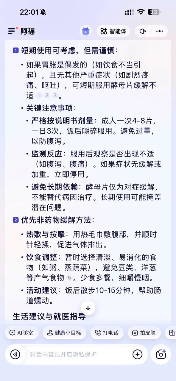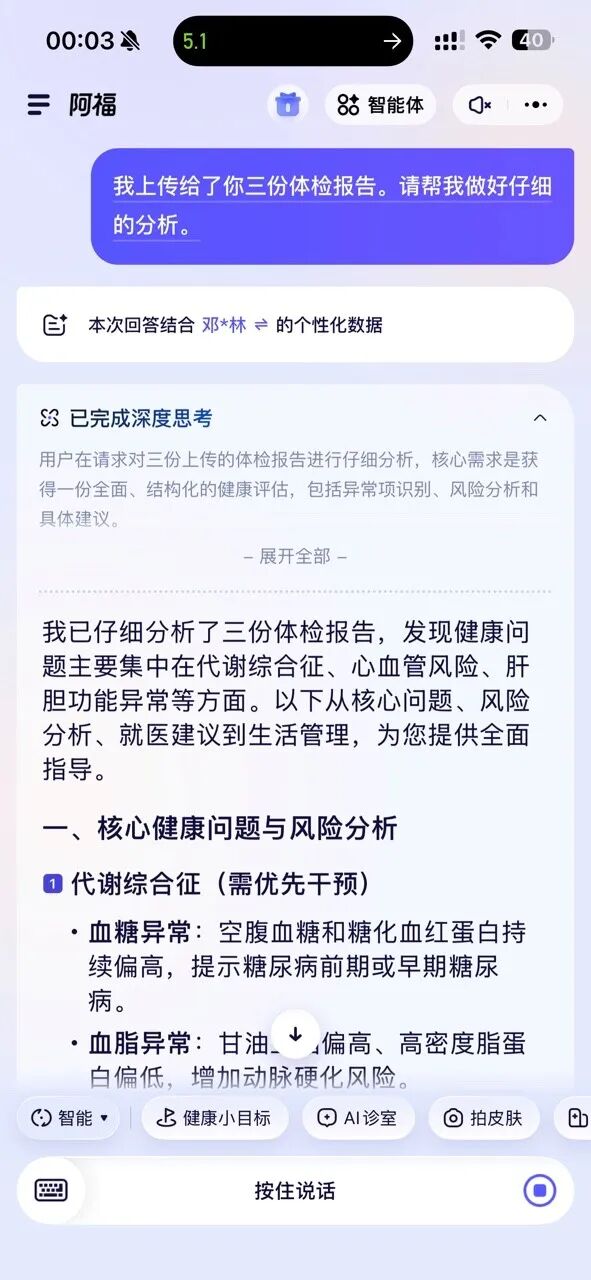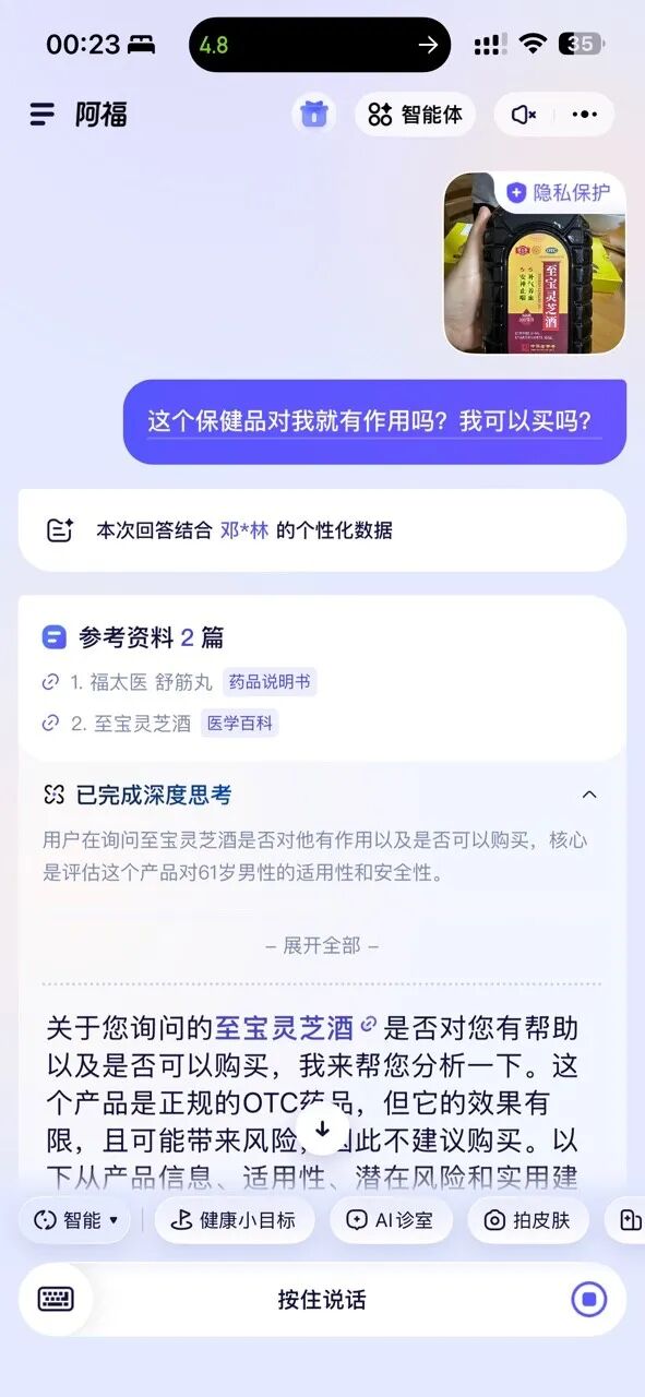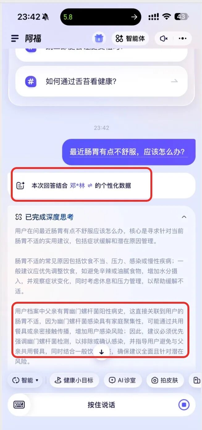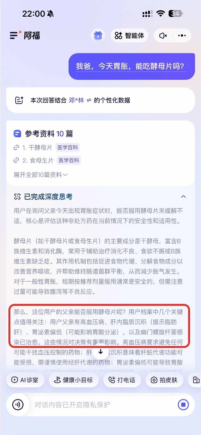 你看,阿福在回答的过程中,就会自动识别我爸的基础信息:高血压、肝内xxx、曾有胃的xx慢性病。基于这套背景为我做量身定制的回答。