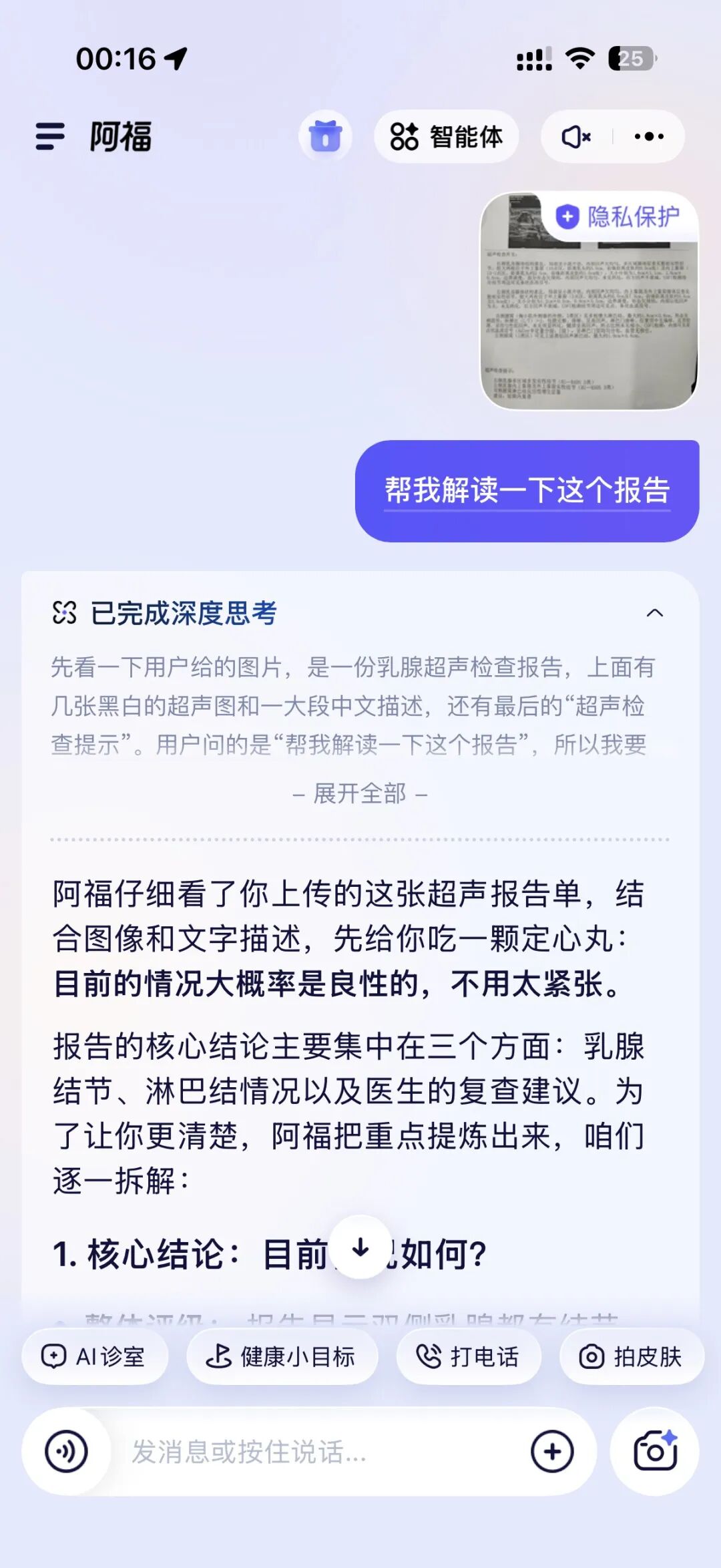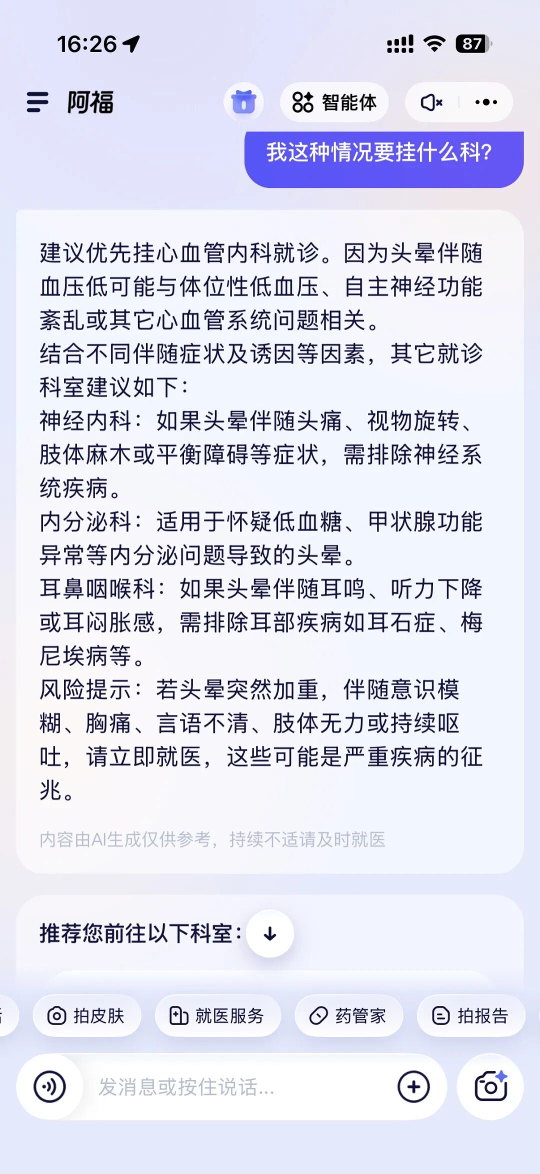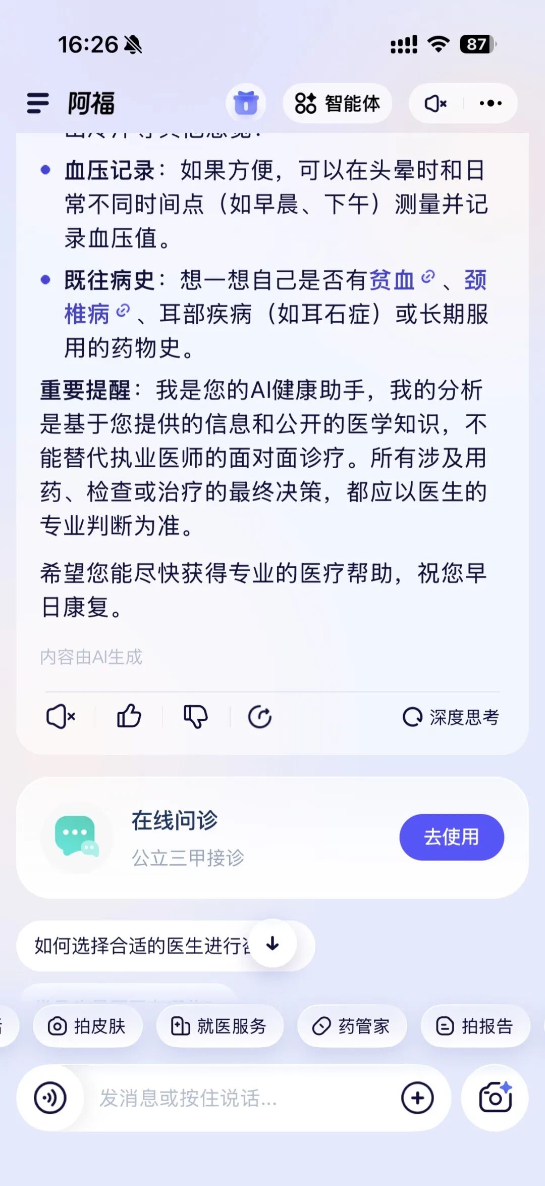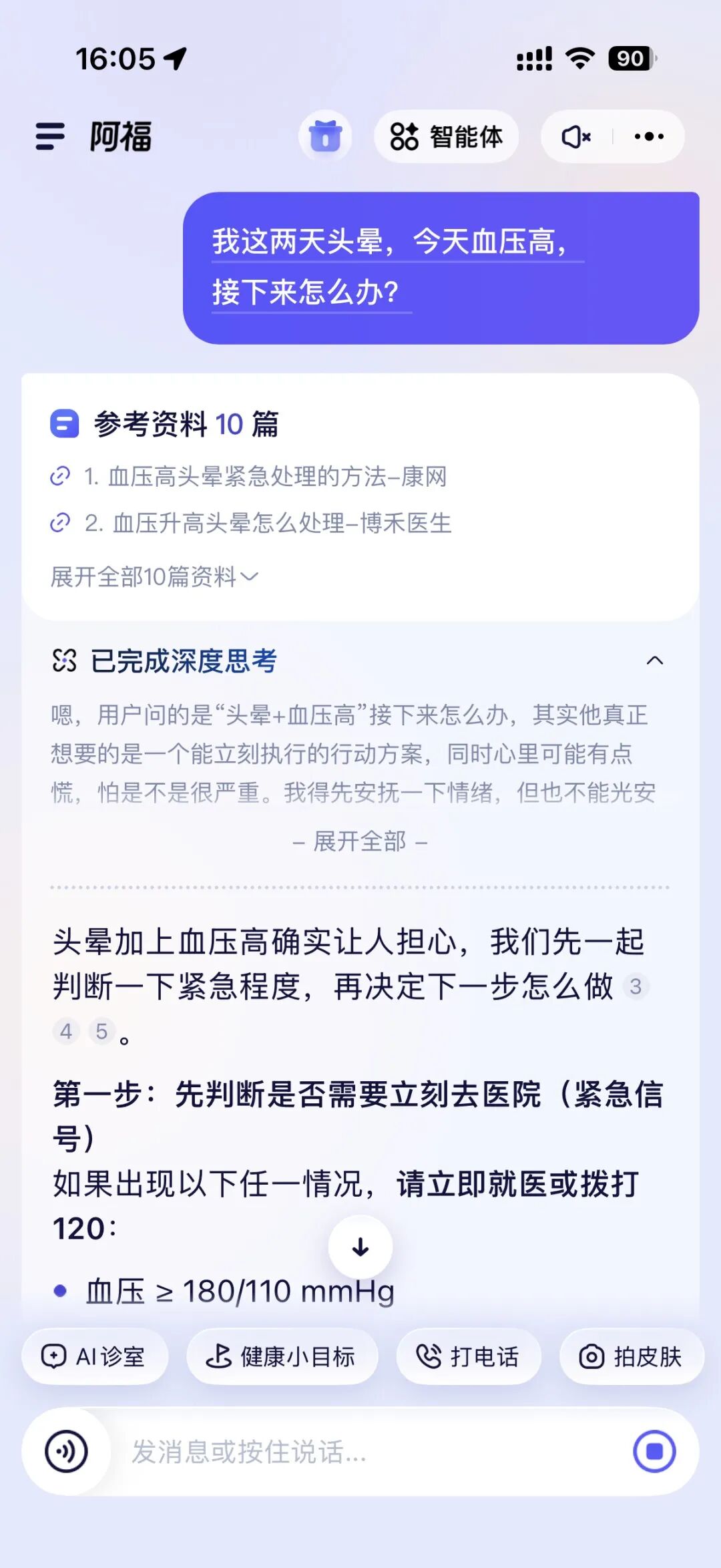 你看,阿福在回答的过程中,就会自动识别我爸的基础信息:高血压、肝内xxx、曾有胃的xx慢性病。基于这套背景为我做量身定制的回答。