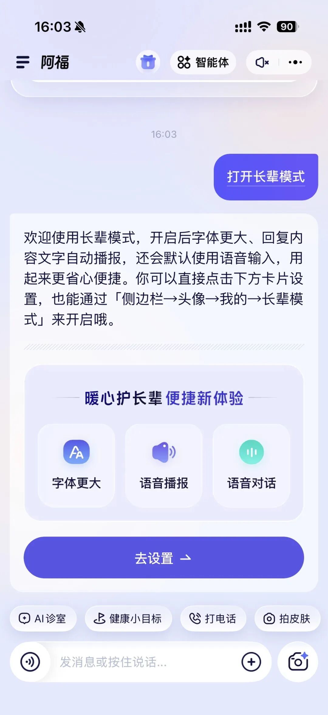 阿福这点做得很实用:字更大、能语音播报、有些长辈习惯说方言,阿福也听得懂。