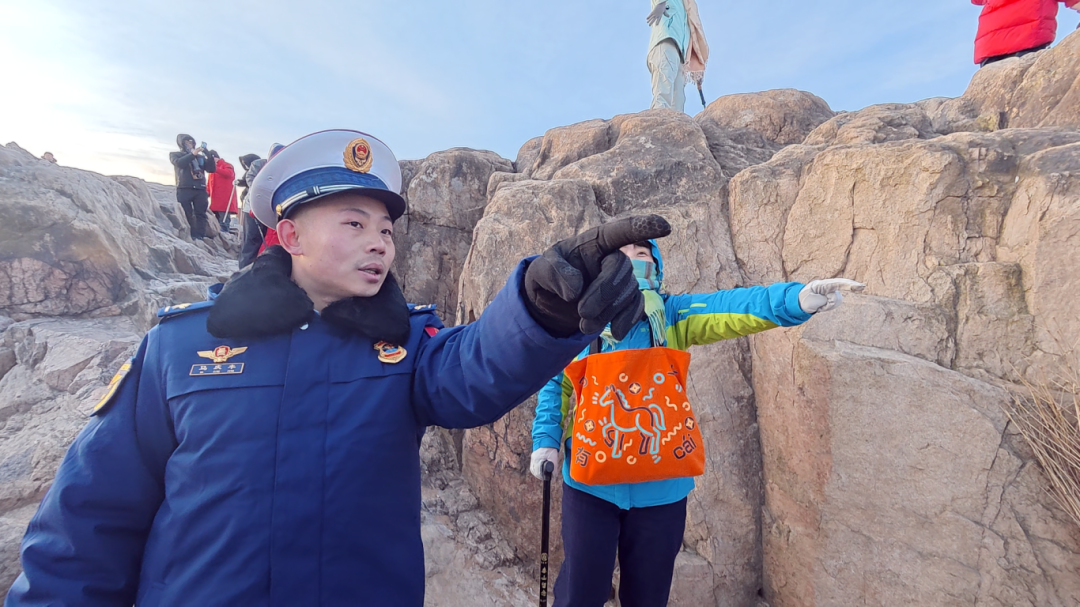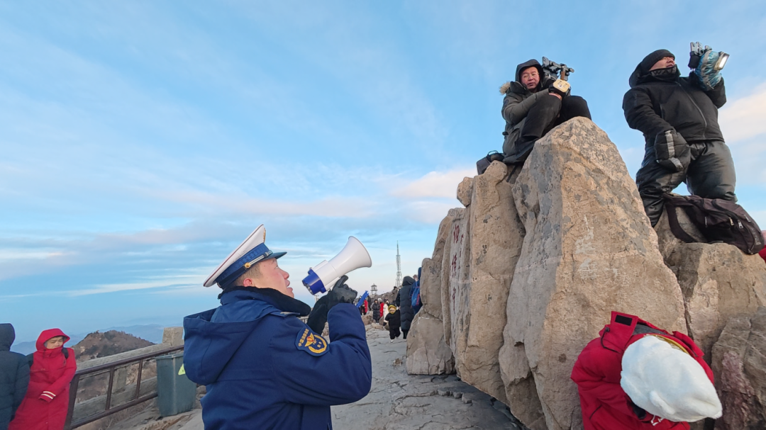 在这激动与拥挤之中,几抹“火焰蓝”的身影,正沉稳而敏捷地穿梭在岩石与人群的缝隙里。日常,无论是否举行升旗仪式,在泰山的重要观日出地段,消防员每天都要到岗执勤,维护观日出游客的秩序,随时准备应对突发状况。“日出时刻别光顾着兴奋、高兴,一定要注意脚下台阶!”“带小朋友的家长请照看好孩子,不要往边缘靠近!”副站长王乐川手持便携扩音器,声音清晰有力,穿透寒风。他和队员们沿着观景平台最外侧的险要地段,筑起一道流动的“人墙”。他们每个人的站位都经过精心考量——既能随时干预危险行为,又为游客留出了足够的观景空间。