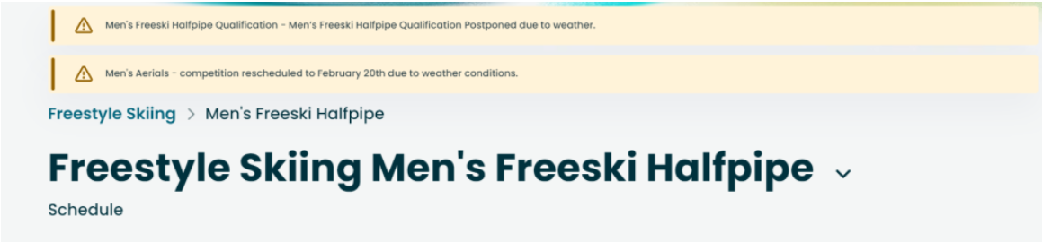 由于天气原因,2026年米兰-科尔蒂纳冬奥会组委会宣布原定在2月19日举行的自由式滑雪男子空中技巧比赛延期至20日,预赛开始时间为10:30,决赛开始时间为13:30,均为当地时间。 图片来自国际奥委会官网 男子预赛最早原定于17日开赛,因天气原因改至19日,但因利维尼奥持续降雪,场地条件不适合举办该项赛事,比赛再次改期。中国队4名选手孙佳旭、李天马、齐广璞、王心迪将参加该项比赛。 (新华社)