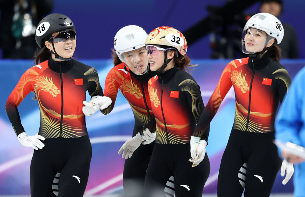 2月18日,中国队选手公俐、张楚桐、杨婧茹和王欣然(从左至右)在女子3000米接力B组决赛后。新华社记者 李明 摄