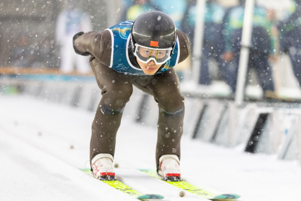 2月19日,中国选手赵嘉文在北欧两项团体短距离跳台滑雪项目比赛中。新华社记者 孟永民 摄