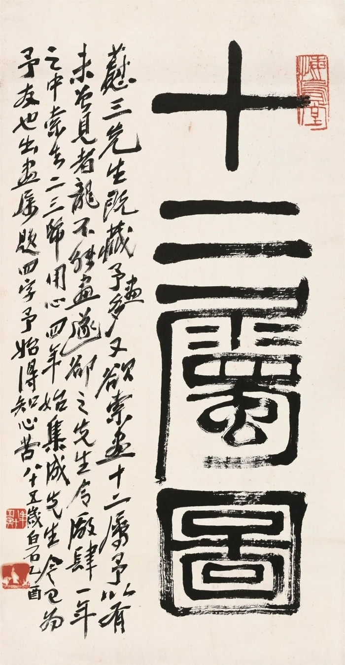 作为齐白石艺术生涯中的珍稀之作,《十二属图》的诞生背后藏着一段跨越四年的艺坛佳话。民国时期收藏家关蔚山先生仰慕白石大师艺术造诣,希望定制一套十二生肖画作,却因齐白石秉持“不画未见之物”的原则,被以“龙非日常所见”为由婉拒。最终,关蔚山通过厂肆逐年委托,历时四载终成全套。1945年,齐白石亲笔题写“十二属图”并作题跋,感叹“...用心四年,始集成。先生今已为予友也...”,成就了一段知己相交的美谈。