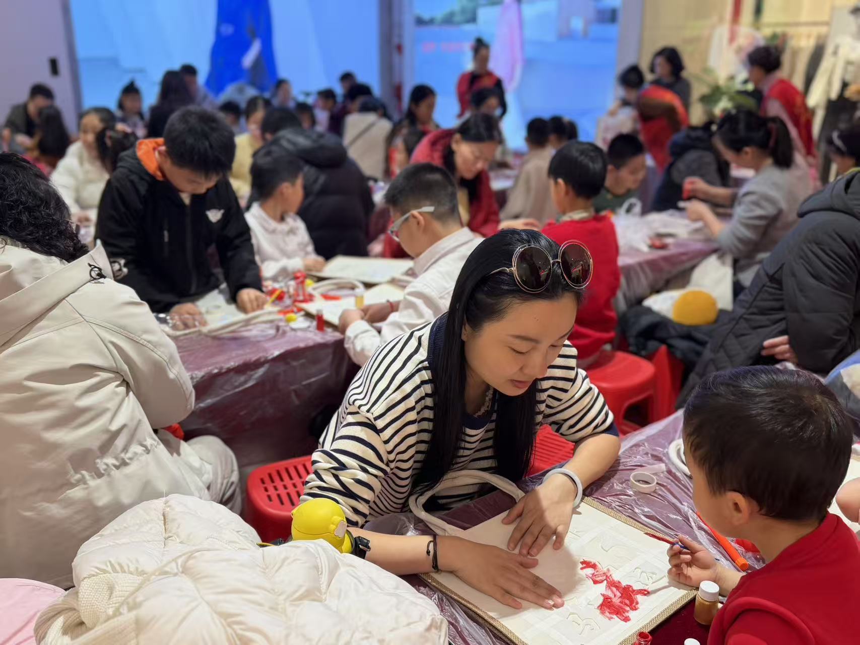 巡游结束后,孩子们在专业老师的指导下,投入到“马年行大运”拓印麻布袋手作环节。大家以传统拓印工艺为载体,将“福马”“26”“马行大运”等新春元素印在麻布袋上,亲手打造出专属的新年伴手礼。这一过程不仅让孩子们近距离感受非遗魅力,也在亲子协作中增进了情感联结,让传统文化在趣味体验中得到传承。