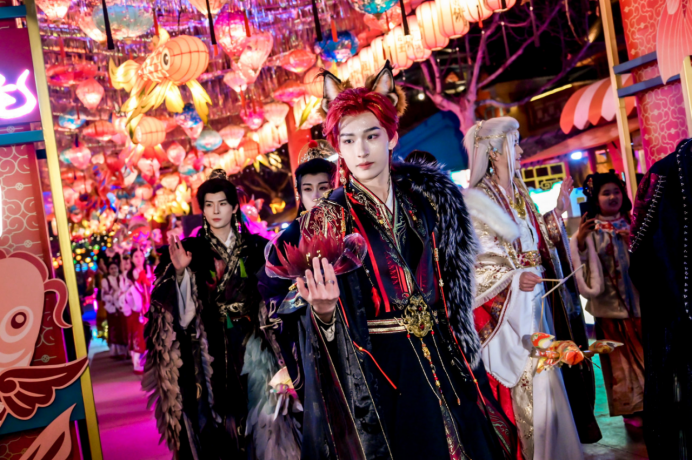 “天官祈愿妙会”惊艳开秀,成为灯会现场焦点。田峻彰、陈沐一等知名国风达人悉数亮相,身着天官赐福主题华服,衣袂翩跹、仙气十足,尽显中式国风浪漫。国风达人们不仅献上高能群舞表演,更领衔开启巡游狂欢,华服与花灯相映成趣,氛围感拉满。游客们纷纷加入互动,解锁银票、孔明灯等专属福利,沉浸式感受祈愿纳福的新春氛围,现场随手一拍皆是国风大片。